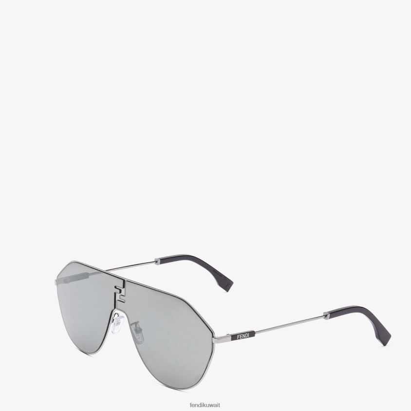 نظارات شمسية كبيرة الحجم مصنوعة من المعدن بلون الروثينيوم. شعار ff مقطوع على العدسة. وسادات أنف قابلة للتعديل وأطراف من الأسيتات باللون الأسود. عدسات مرآة باللون الرمادي.