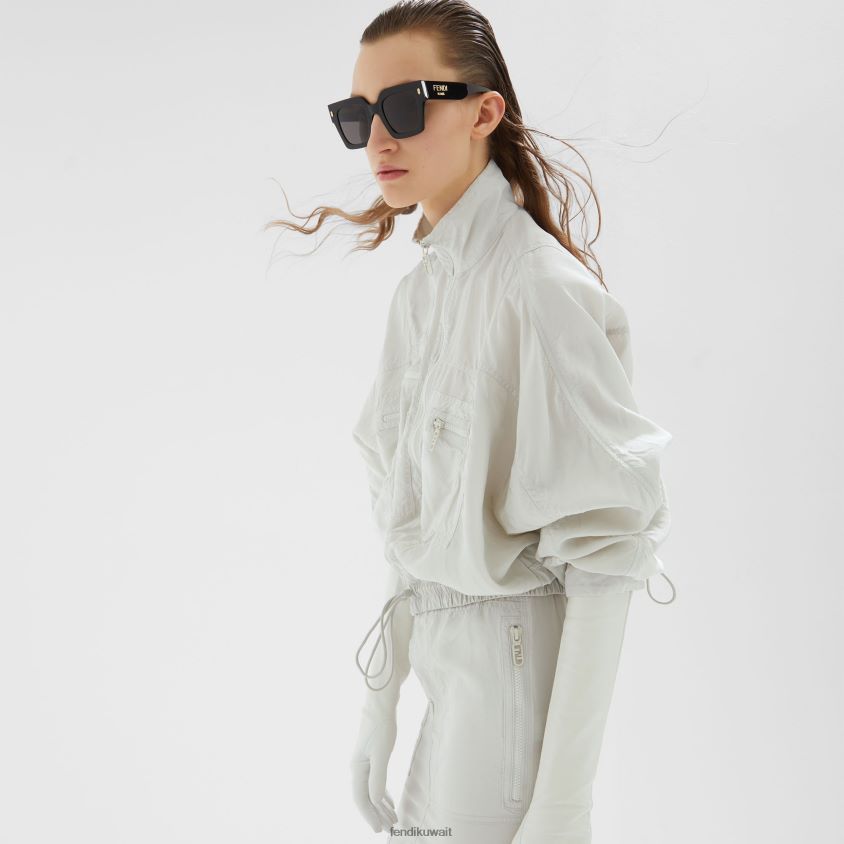 نظارات فندي روما الشمسية المربعة كبيرة الحجم مصنوعة من الأسيتات السوداء. أذرع ذات نواة معدنية مرئية محفورة بالليزر. شعار فندي روما باللون الذهبي على الجوانب. عدسات رمادية.
