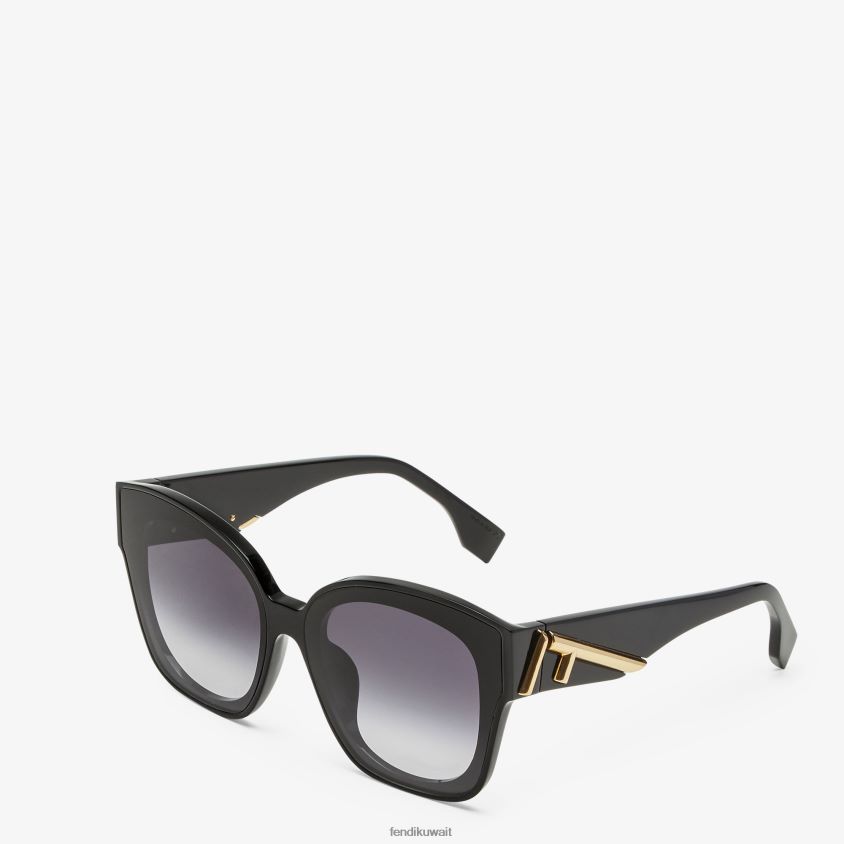 نظارة فندي الأولى مربعة الشكل من الأسيتات باللون الأسود. أذرع ذات شكل حرف F قطري كبير الحجم من المعدن الذهبي اللون. عدسات زرقاء متدرجة.